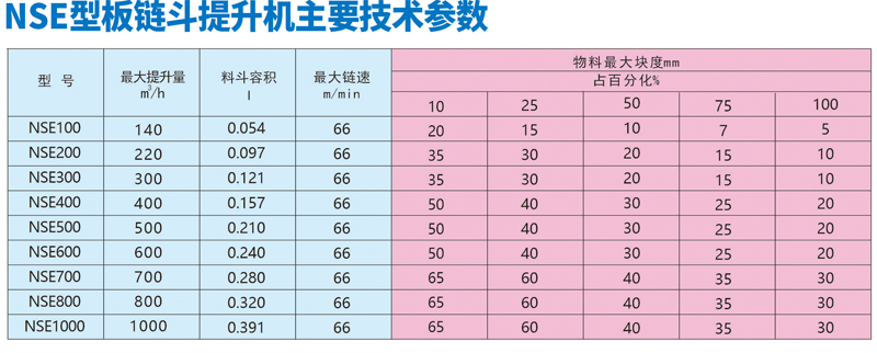 NE、NSE型闆鏈鬥式提升機(jī)采用自(zì)流式裝料,重力誘導式卸料。輸送鏈采用合金高強度闆式鏈條,耐磨而可(kě)靠。适用于物料溫度在250°C以下,中、大(dà)塊和有磨琢性的物料的垂直輸送。是國(guó)内同類提升機(jī)中相(xiàng)近結構尺寸輸送量大(dà)的提升機(jī),能耗低,可(kě)逐步替代其他(tā)類型的提升機(jī)。