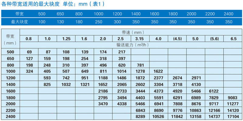 本系列帶速範圍爲0.8~6.5m/s,其中常用值爲0.8~ 5.0m/s。帶速、帶寬與匹配能力見(jiàn)表二。(注: 1、輸送能力系按水平輸送、動堆積角爲20°,托輥槽角爲35°時計(jì)算的。2、表中帶速4.5m/s, 5.6m/ s爲非标準值,一般不推薦選用。)